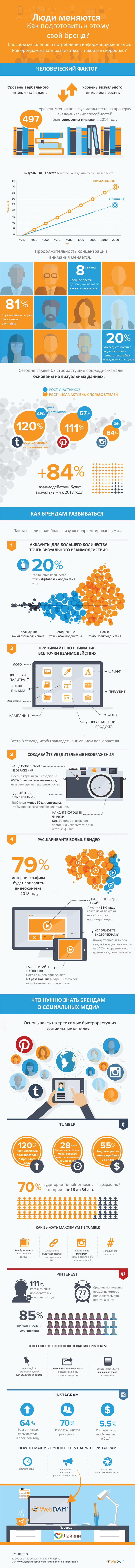 Пользователи меняются. Становятся другими не только их интересы и предпочтения, но и механизмы восприятия информации. Например, на сегодняшний день мы имеем дело с визуальными пользователями. Какие точки соприкосновения нужно использовать в новых условиях, как выстраивать визуальную коммуникацию в сети и как изменится ситуация к 2018 году, из нашей инфографики.