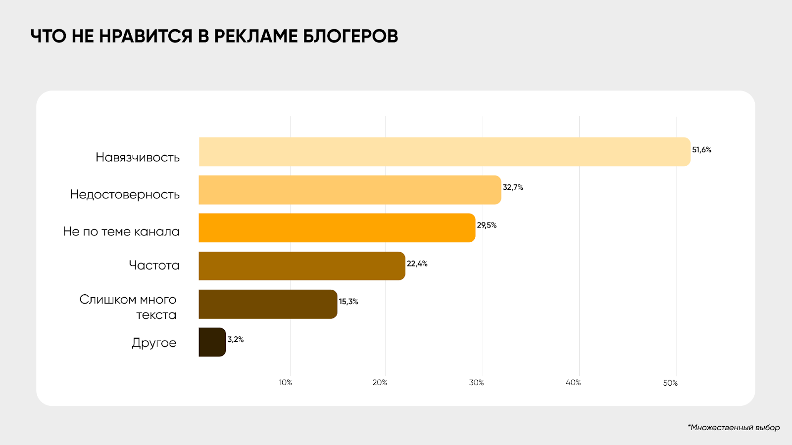 - Критерии выбора блогеров: активность подписчиков (71,2%), соотношение охвата и аудитории (60,3%), тематика канала (56,2%), доверие аудитории (52,1%).