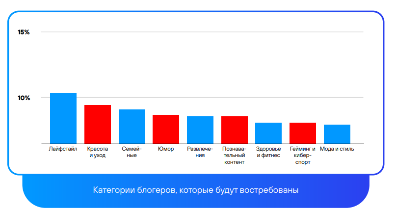 - В топ востребованных категорий блогеров попали лайфстайл (10%), красота и уход (8%), семейные блоги (7%), юмор (6%).