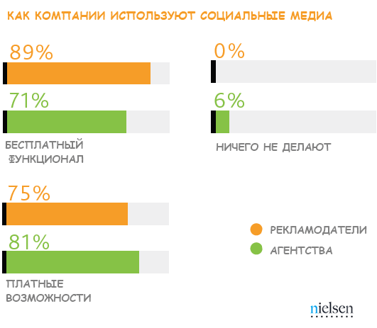 В то время как 89% рекламодателей используют бесплатные возможности социальных сетей (страницы, посты, лайки, пины), 75% также выделяют бюджеты на платную рекламу в соцмедиа (спонсированный контент, брендирование и увеличение лайков). В будущем 64% рекламодателей планируют увеличить бюджеты на рекламу в социальных медиа.