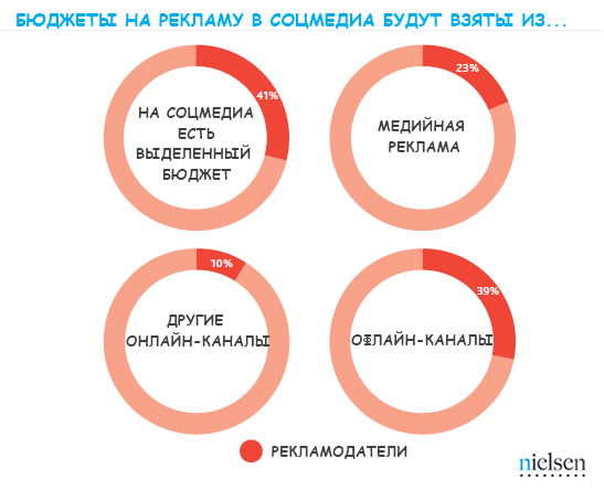 Также стоит отметить, что выделенный бюджет на рекламу в социальных сетях имеют только 41% компаний. Большинство рекламодателей планирует увеличивать бюджеты на социальные медиа, сокращая затраты на другие каналы, как онлайн, так и офлайн.