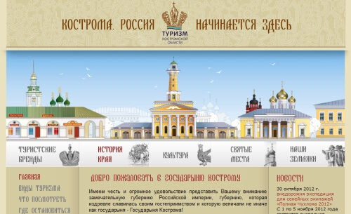 - развитие и оптимизация официального туристического портала Костромской области kostroma.ru. Разработчики сайта значительно изменили его в соответствии с рекомендациями специалистов Google, а также создали мобильную версию сайта.