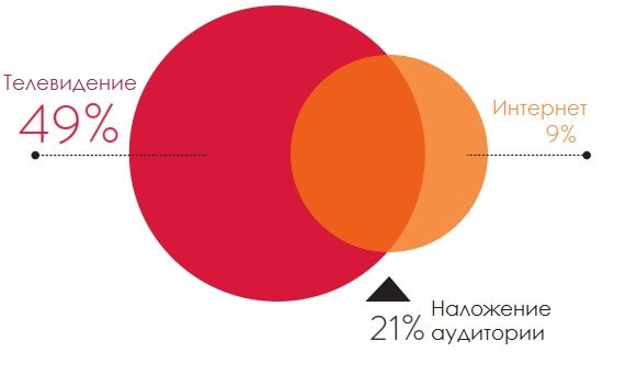 Насколько все плохо с финансовой точки зрения? Предположим, что кампания достигает 70% телевизионной и 30% интернет аудитории. Случайное наложение аудитории составляет 21%. Это значит, что из 30 человек запланированной аудитории только 9 увидят рекламу исключительно в интернете. Заинтересовать 9 человек вместо запланированных 30 рекламодателю крайне невыгодно” -, прокомментировали Nielsen.