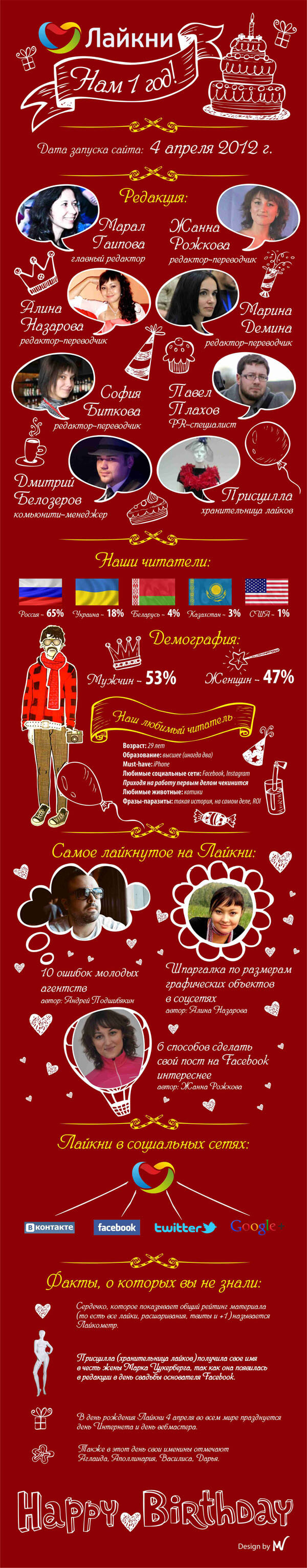 1 год пролетел, как одно мгновение. Лайкни празднует свой первый день рождения. За это время мы написали более 700 материалов и собрали почти 29 тысяч лайков. По странному стечению обстоятельств наибольшей популярностью у наших читателей пользовались инфографики. Поэтому не будем предаваться многословию и в свой день рождения предлагаем вам взглянуть на нашу инфографику. Вы узнаете немного больше о нашей редакции, о себе и о странных фактах, которые имеют место быть в этот праздничный день.