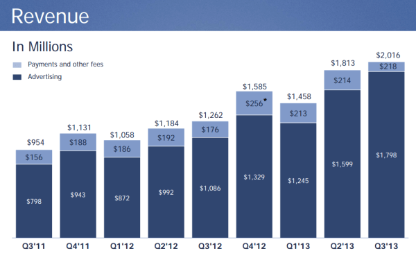 Социальная сеть Facebook представила финансовый отчет за 3 квартал 2013 г. Общий доход компании составил $2,02 млрд., что на 60% больше прошлогоднего показателя.