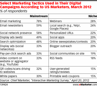 При продвижении брендов маркетологи чаще всего прибегают к email-маркетингу, показал в США, проведенный в марте 2012г. Его используют 78% респондентов. На втором месте оказались электронная рассылка (59%) и присутствие в социальных сетях (58%). Кроме того маркетологи для продвижения брендов часто используют медийную рекламу и поисковую оптимизацию (49% и 48% соответственно).
