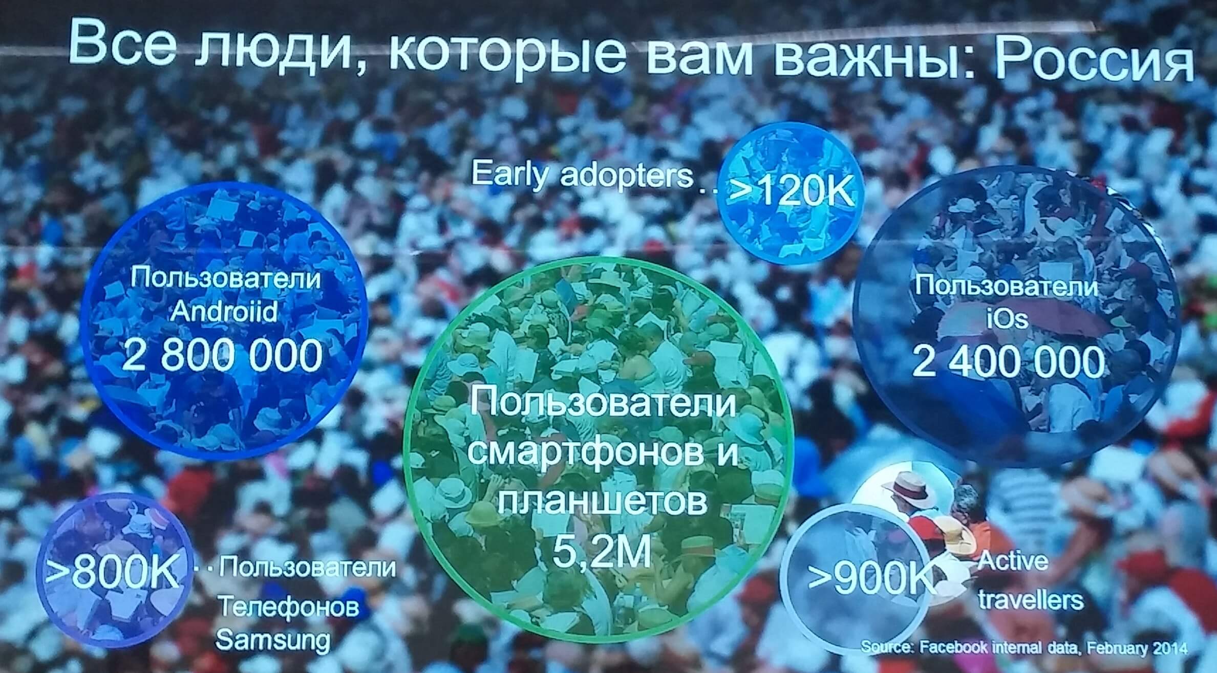 Российская аудитория растет достаточно быстро. Если говорить о российских пользователях вообще, то уже больше половины пользуются Facebook исключительно с мобильных устройств ежедневно.