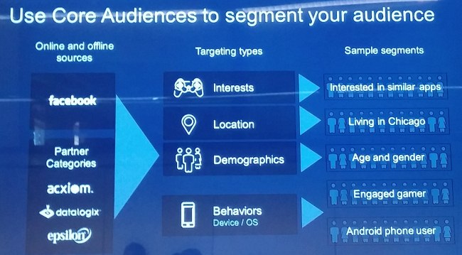 - Core Audiences – основные готовые аудитории для мобильного таргетинга. Люди на Facebook оставляют о себе много информации: что им нравится, что они обсуждают. Используя данные об их интересах, демографии, Facebook формирует аудитории доступные для таргетинга – например, родители детей до 2 лет, пользователи, которые только что обручились и т.д.