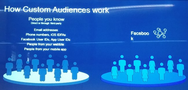 - Custom Audiences – это клиенты компании на Facebook. Использование этой функции позволяет получать конверсии по минимальной цене. Custom Audiences позволяет найти людей, которые уже являются клиентами компании, используют приложение, заходили на сайт, и таргетировать рекламу именно на них. Как это делается: в self-serve интерфейсе или Power Editor можно подгрузить базу email-адресов, телефонов и т.д. и эта база сопоставляется с базой Facebook – и рекламодателю выдается аудитория, на которую в дальнейшем можно таргетировать объявления. Например, можно таргетировать рекламу нового приложения на пользователей, которые уже скачали ранее другое приложение компании.