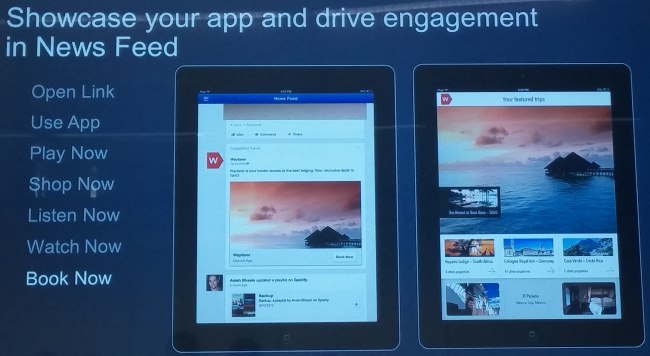 Однако приложение должны не только находить, но им также должны пользоваться. В среднем у пользователя 27 приложений на телефоне, половину из которых он не использует. Что делать? Для этого у Facebook есть мобильная реклама, которая позволяет стимулировать действия внутри приложения. Facebook позволяет найти пользователей, которые уже скачали приложение, и им можно показывать рекламу с call-to-action кнопками, напоминать, к примеру, забронировать отель.