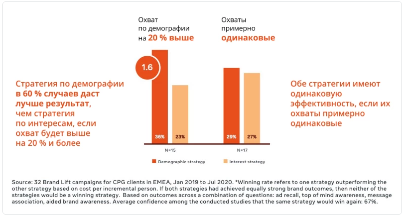 Анализ показал, что в 50% кампаний рекламодатели сужали аудиторию по интересам слишком сильно. Если бы они выбрали стратегию по демографии, то получили бы в два раза больше охвата за тот же бюджет.