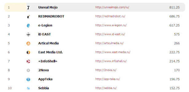 Первое место рейтинга заняла компания Unreal Mojo, на второй и третьей строке расположились Redmadrobot и e-Legion.