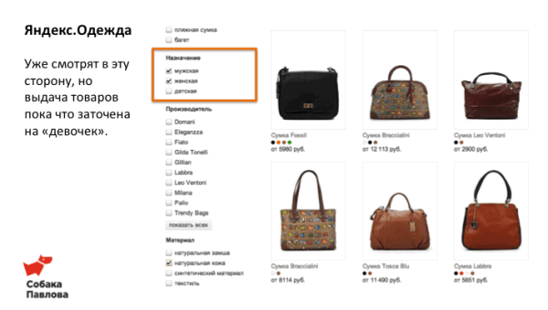 Сервис «Яндекс.Одежда» реализует модель парного потребления, предоставляя возможность одновременно просматривать мужские и женские товары.
