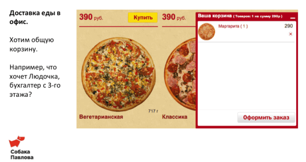 Еще одна частая ситуация — совместный заказ обедов в офис. Обычно кто-то собирает все пожелания вживую или по почте и делает заказ. Гораздо удобнее было бы собирать одну корзину с разных компьютеров без регистрации. Например, при помощи реферальной ссылки.