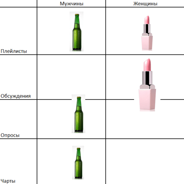 Активность обоих полов на сайте для наглядности представлена в бутылках и помаде.