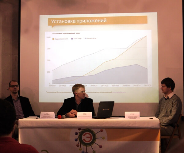 Далее Илья Широков передал слово Анатолию Объедкову, руководителю проекта Appdata.Ru, который представил аудитории сравнительную характеристику социальных сетей Рунета по играм. В самом начале своего выступления Анатолий отметил, что у Appdata.Ru до сих пор существуют некоторые проблемы с получением данных по установкам игр во ВКонтакте.