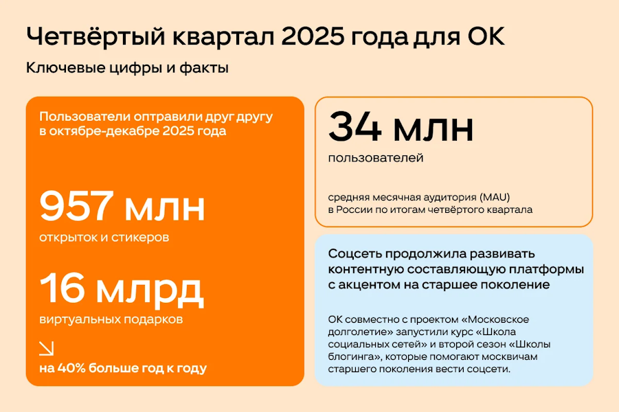 Социальная сеть Одноклассники представила итоги за четвертый квартал 2025 года.
