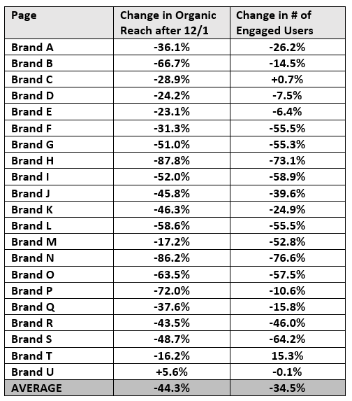 Аналитики Ignite Social Media также отмечают существенное уменьшение органического охвата постов в Facebook. Изучив 689 публикаций 21 крупного бренда, компания пришла к выводу, что на неделе, когда Facebook сделал заявление, охват упал в среднем на 44%.
