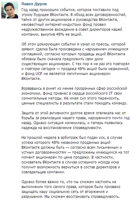 В свою очередь основатель соцсети обвинил фонд в незаконности действий и объявил о намерении бороться за справедливость. На своей странице ВКонтакте он опубликовал пост, где объяснил причины подачи встречного иска к UCP: