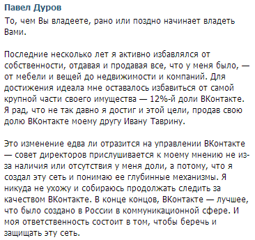 (01.04.2014) На странице основателя социальной сети ВКонтакте Павла Дурова появилось сообщение о его окончательном уходе с поста генерального директора: