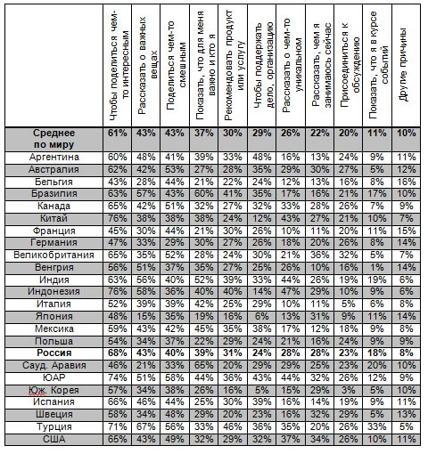 Пользователи социальных сетей готовы делиться только интересными постами. Компания Ipsos провела по всему миру с целью выяснить, почему люди делятся контентом в соцсетях. Оказалось, что 61% пользователей размещают посты, чтобы «поделиться чем-то интересным». Другие причины расшаривания контента – «рассказать о важных вещах» (43%), «поделиться чем-то смешным» (43%).