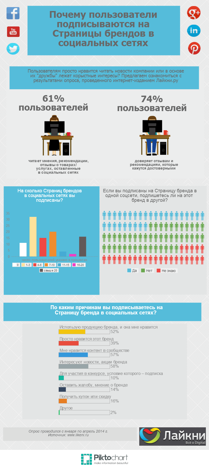 С января по апрель 2014 г. Лайкни проводил опрос среди пользователей социальных сетей, чтобы узнать, что движет людьми, когда они подписываются на Страницы брендов. Предлагаем ознакомиться с результатами проведённого исследования.