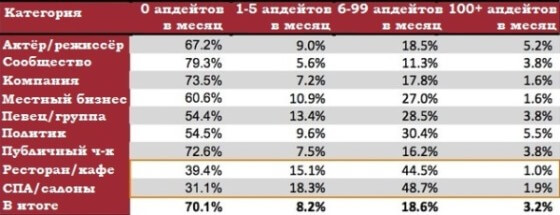 Бездействуют в Facebook и селебрити, однако им это прощается: Страницы звёзд за период с марта по октябрь 2012 г. нарастили базу фанов в среднем с 9144 до 11713. В это же время Бизнес-страницы растеряли своих Facebook-подписчиков: если в марте их было в среднем 6407, то в октябре осталось 3233.