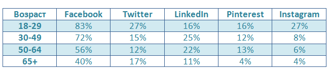 Пользователи в возрасте 18-29 лет активно пользуются всеми соцсетями сразу. Подавляющее большинство пользователей социальных сетей этой группы (83%) можно найти в Facebook. Они не забывают про Twitter (27%), Pinterest (16%), Instagram (27%). А вот преобладающей аудиторией для LinkedIn являются пользователи в возрасте 30-49 лет (25%).