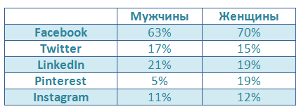 Прежде всего, начнем с гендерных показателей. Женщины, известные любительницы картинок и многословных постов, предпочитают Facebook, Pinterest и Instagram. Сдержанные и деловые мужчины, напротив, численно преобладают в LinkedIn и Twitter.