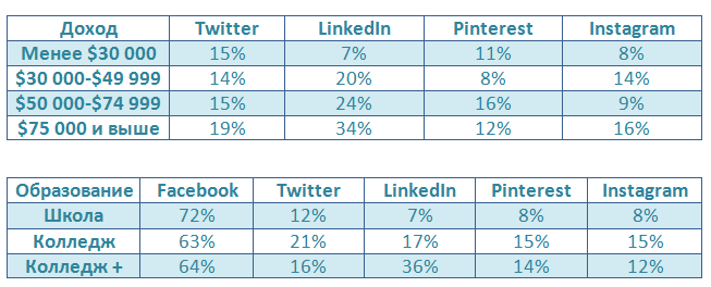 А вот LinkedIn не зря называют соцсетью для профессионалов: в процентном соотношении социальная сеть особо популярна среди пользователей с высшим образованием и доходом более $75 000 в год. Instagram, Pinterest и Twitter с удовольствием используют выпускники и учащиеся американских колледжей, чей уровень дохода варьируется от 30 до более 75 тысяч долларов в год.