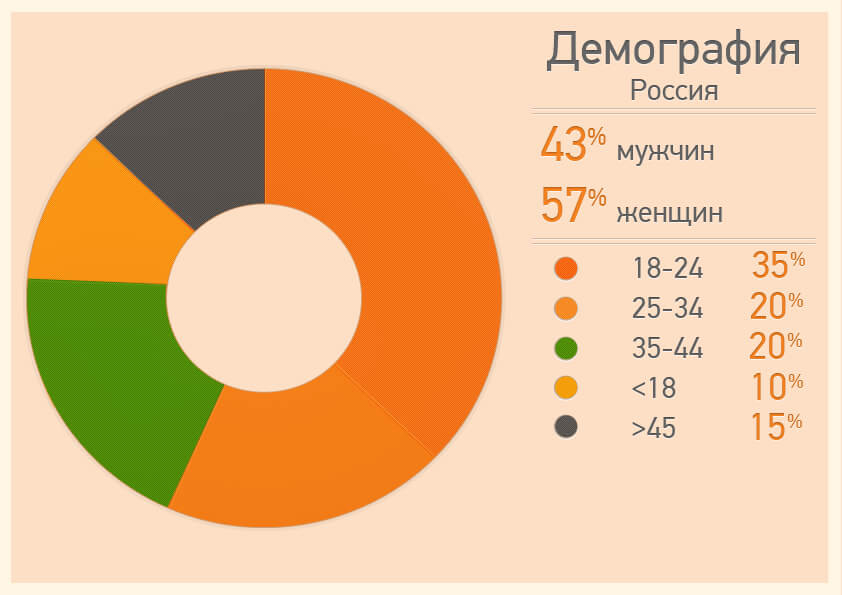 Более 68% пользователей ВКонтакте старше 25 лет. Согласно сервису рекламных объявлений, женщин здесь всего 42% (около 62 млн). Примерно 70% посетителей проживают в России. 25% посетителей из России проживают в Москве, 13% — в Санкт-Петербурге.