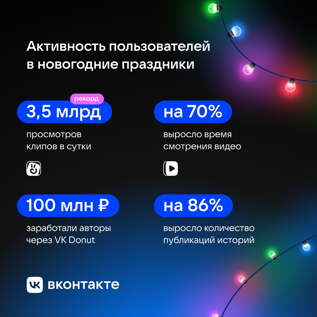 На новогодних праздниках пользователи ВКонтакте установили рекорды просмотра видеоконтента и поддержки авторов. Так, суммарное время просмотров VK Видео выросло на 70% год к году, пик пришелся на 10 января – 4,1 млрд минут за сутки. Почти половина времени просмотра пришлась на телевизоры.