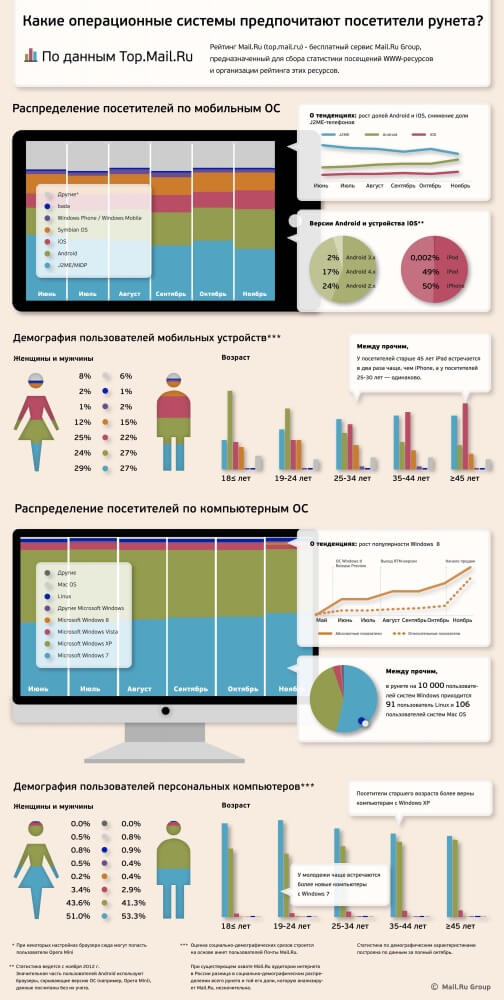 Рейтинг Mail.Ru представил данные по самым популярным операционным системам Рунета, как мобильным, так и десктопным. Если говорить, о мобильных ОС, у пользователей наибольшей популярностью пользуются J2ME (у 29% женщин и 27% мужчин). Однако лидер вскоре может измениться: доля Android становится все больше - 24% и 27%, соответственно. iOS также не отстает – устройства с данной ОС имеются у 25% женщин и 22% мужчин.