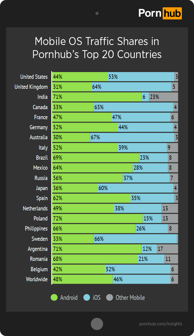 Если вы думали, что порноиндустрия – это бизнес с легким привкусом запрета и стыда, то спешим вас разуверить. Да-да, сейчас самое время сдержать свой смех, ведь вашему вниманию представляется исследование от самого скандально известного в России сайта Pornhub, специалисты которого сравнили, какое порно предпочитают смотреть пользователи iOS и Android. Да, порноиндустрия старается учитывать интересы потребителя.
