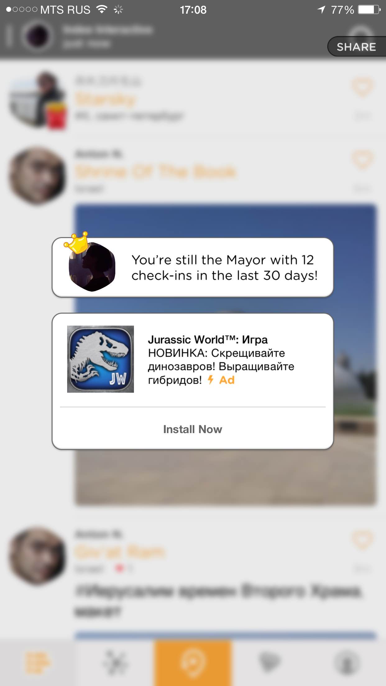 Российские пользователи Swarm стали получать рекламные сообщения после чекинов. Официально возможности размещения подобного рода рекламы в Swarm не существует в России, показ объявлений оказался возможен благодаря партнерской сети мобильных приложений Facebook.