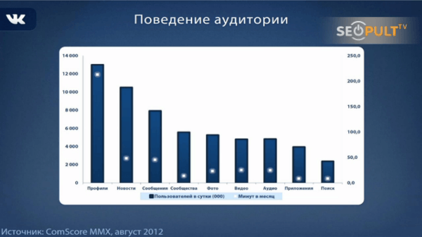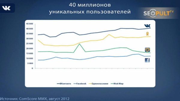 Ссылаясь на августовские данные comScore MMX, представитель соцсети сообщил, что аудитория активных пользователей ВК по всему миру составляет 60 млн. уников. Из них 40 млн. приходятся на Россию. При этом 70% активных участников социальной сети составляют её ядро: заходят минимум раз в неделю. Ежедневно же ВКонтакте посещают 25 – 30 млн. уников.