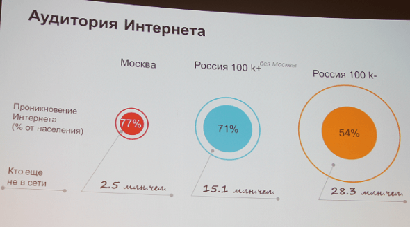 В первый день конференции секцию «Что ждет социальные медиа? Тренды, аналитика и факты!» открыла Наталья Цветкова, TNS, с докладом «Соцсети. Невозможно отказаться». Она представила ряд интересных статистических данных об использовании социальных медиа в Рунете. Так, по информации TNS, количество уникальных пользователей Рунета в марте этого года составило 660 млн человек. Уровень проникновения Интернета представлен на графике: