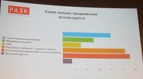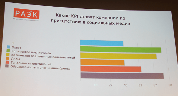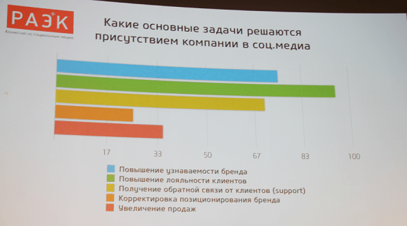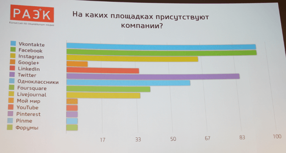 Как видно из графика, по степени присутствия компаний уверенно лидируют Facebook и ВКонтакте. К сожалению, ни одна из соцсетей, представители которых выступали на секции, не попала в топ 3.