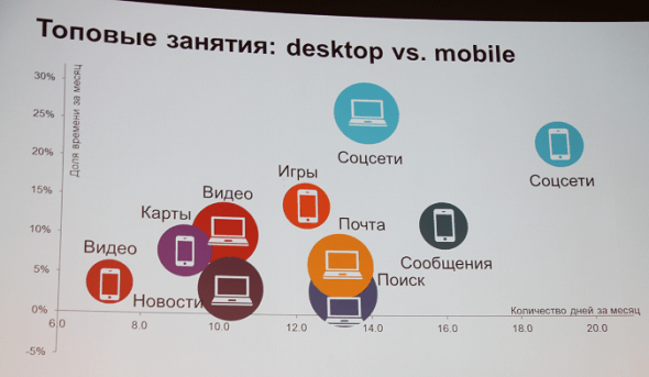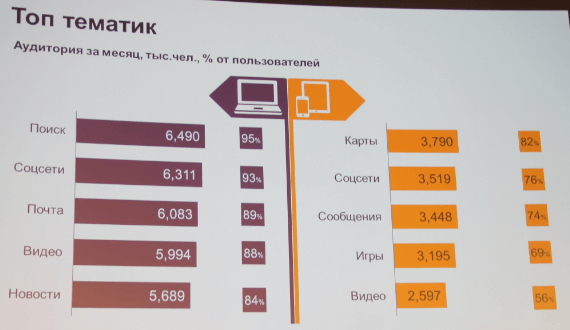 Помимо этого, Наталья представила топ тематик, интересующих пользователей мобильных устройств и обычных компьютеров.