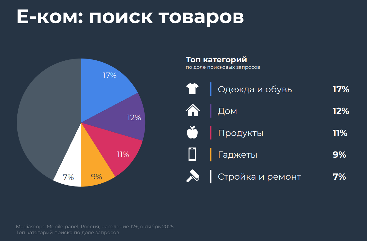 82% россиян хотя бы раз в месяц посещают e-com ресурсы и тратят на это в среднем 28 минут в день. Наиболее востребованными категориями остаются одежда и обувь, товары для дома, продукты, гаджеты, товары для стройки и ремонта.