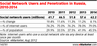 Кстати, по наблюдениям eMarketer, российские пользователи «ВКонтакте», «Одноклассников» и «Моего Мира» активно переходят в Facebook. К удивлению компании, в 2012 году в западной соцсети будет уже 25,3% (вместо предполагаемых ранее 22,7%) российских соцпользователей. Интересно, что ранее eMarketer наоборот заявлял, что россиянам Facebook не очень-то и интересен, и делал прогноз всего в 19%.