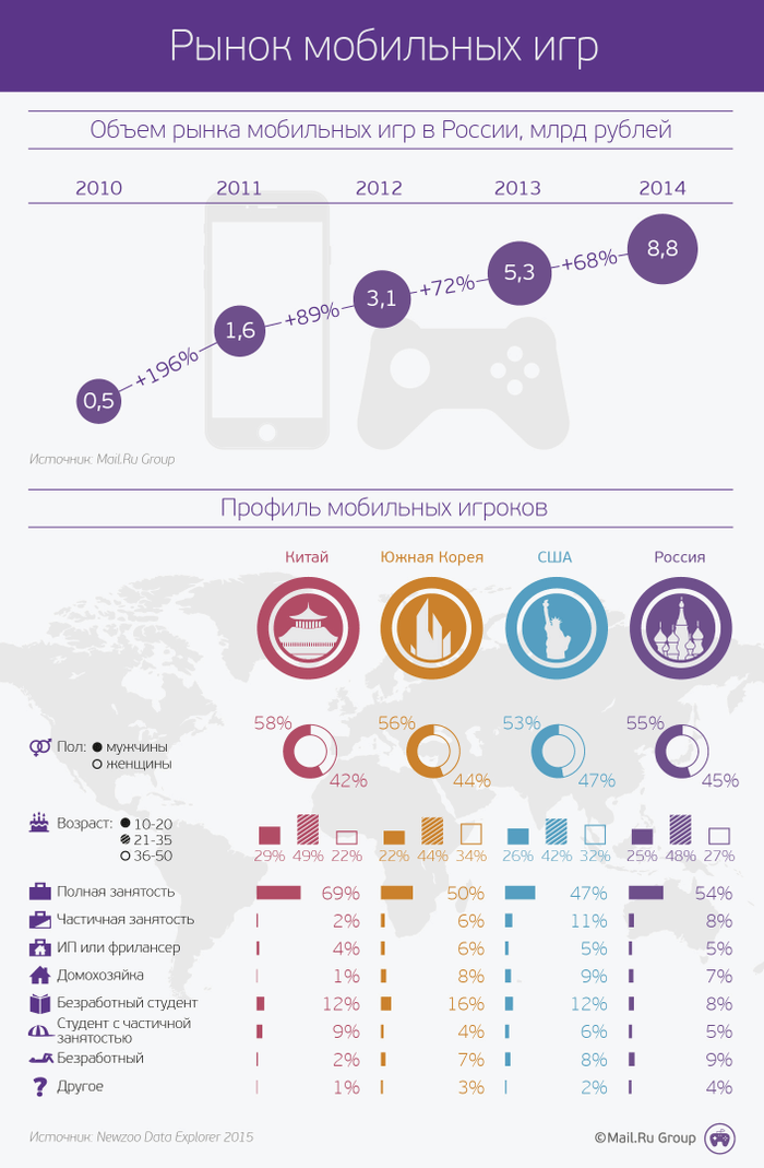 По данным экспертов Mail.Ru Group, в 2014 году рынок мобильных игр в России вырос на 68% и составил 8,8 млрд рублей. Это в 17 раз больше, чем в 2010 году. Василий Магурян, руководитель IT-Territory, студии Mail.Ru Group, отметил, что дальнейший рост сегмента будет происходить так же активно.