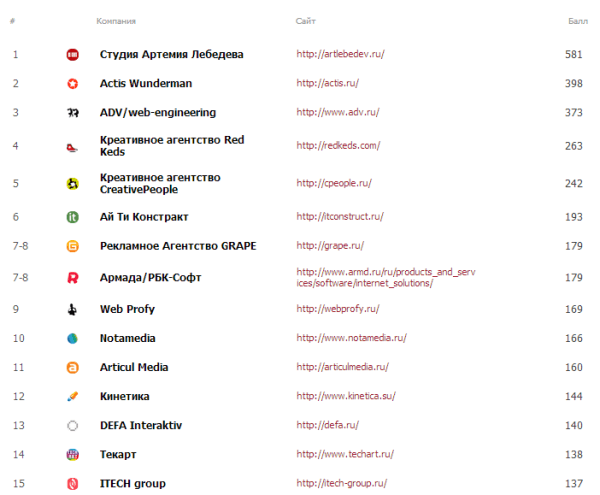 Методика построения Единого Рейтинга прозрачна, и любой желающий может убедиться в правильности расчета итоговых баллов для каждой компании. Поскольку проект Ruward вобрал в себя данные по всем лучшим рейтингам разработчиков интернет-проектов, итоговый чарт получился максимально релевантным текущей рыночной ситуации, а методика его построения позволила включить в Топ-100 только популярные и известные на рынке компании.