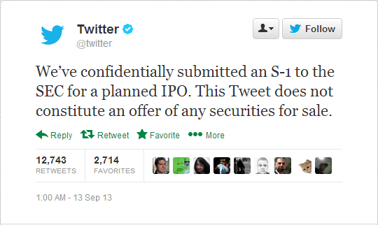 12 сентября компания Twitter подала документы в Комиссию по ценным бумагам и биржам США (SEC) на проведение IPO, о чем сообщила в 135 символах: