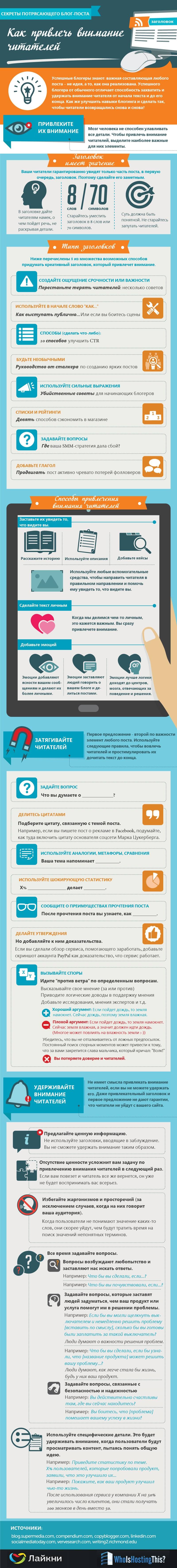 Успешные блогеры знают: важная составляющая любого поста – не идея, а ее реализация. Можно ли удержать внимание читателя от начала текста и до его конца? Как сделать так, чтобы читатели возвращались к вам снова и снова? собрала все секреты успешного блог-поста в данной инфографике.