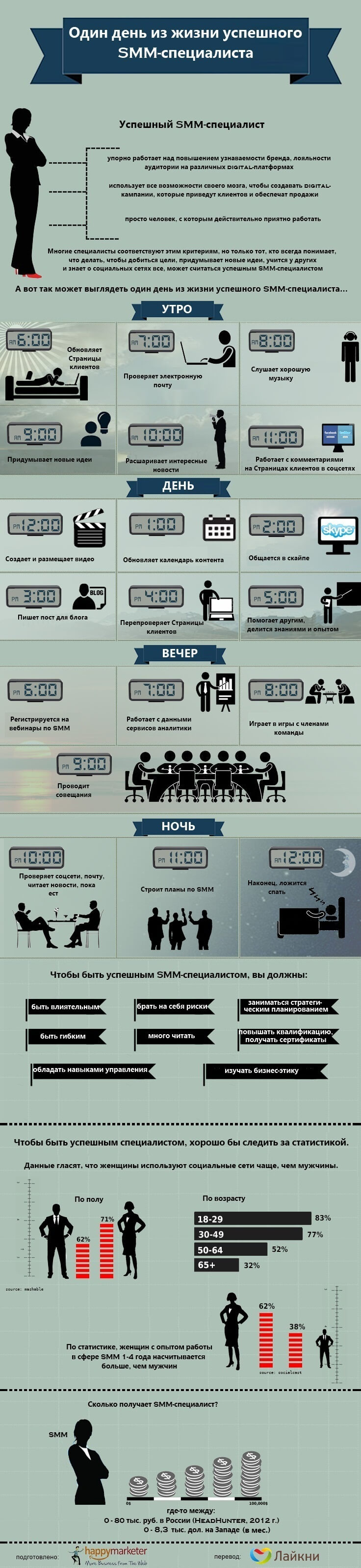 День SMM-специалиста… Как он проходит? Что делает работник этой славной профессии в течение дня? Для каждого уникального специалиста распорядок дня будет выглядеть по-своему. А в условиях постоянной загрузки SMM-специалисты часто вынуждены одновременно выполнять сразу несколько дел: писать посты, консультировать коллег, изучать аналитику, отвечать на письма и выслушивать критику от боссов. Представленная ниже немного упрощает задачи, которые приходится решать в реальной жизни, но в то же время дает некоторое представление, как проходит день SMM-щика.