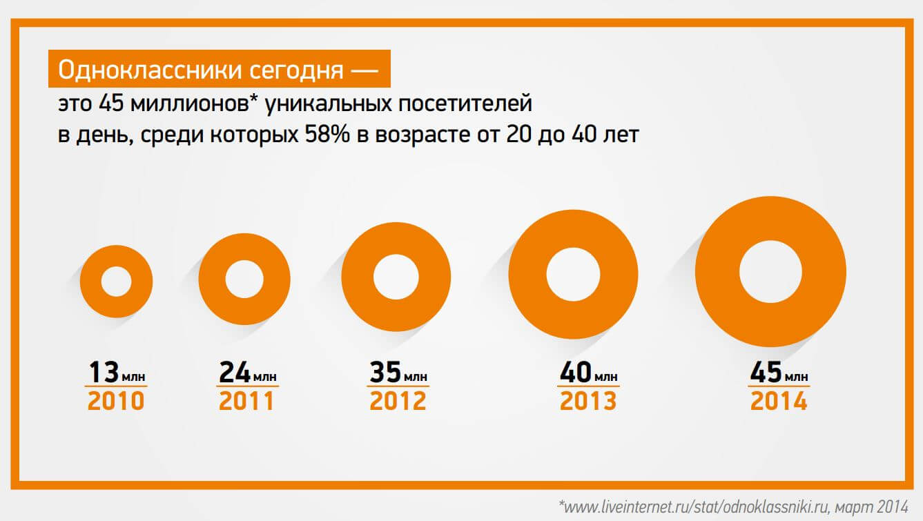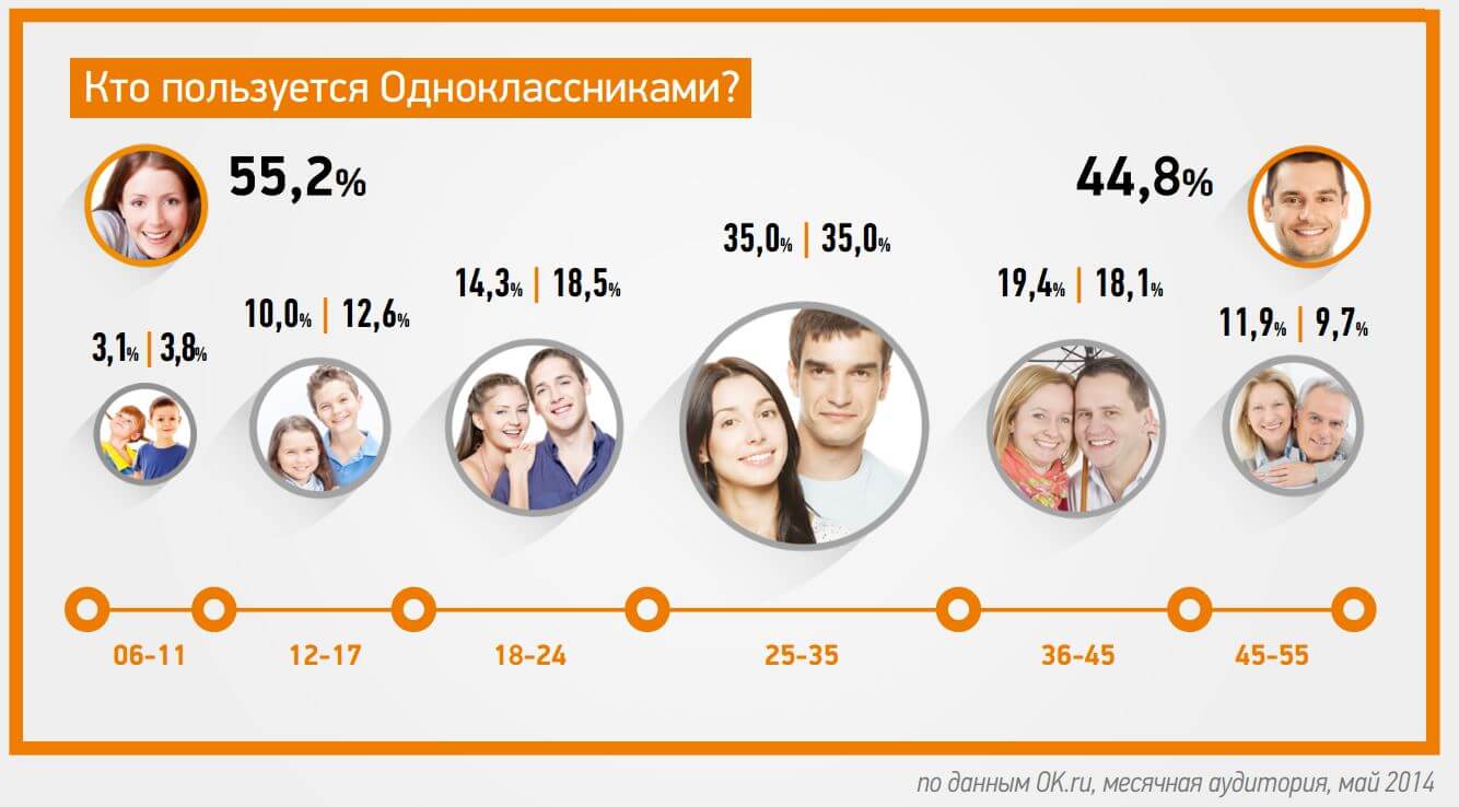 Общая же свежая статистика такова: на сегодняшний момент аудитория одноклассников – это 42-43 млн человек, ее ядро – люди в возрасте 25-34 лет. Гендерное соотношение является примерно одинаковым, с небольшим традиционным перевесом в сторону женщин (55,2% и 44,8%). Основные страны, откуда приходят пользователи – Россия, Израиль, Германия. Важно, что четверть всей аудитории посещает сайт только с помощью мобильных устройств.