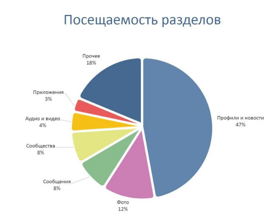 На сегодняшний момент, пользователи Вконтакте отправляют друг в другу в среднем 2 000 000 000 сообщений в сутки и ставят друг другу по 1 000 000 000 лайков. При этом, больше всего они любят смотреть новости и разглядывать профили – эти разделы являются самыми посещаемыми.