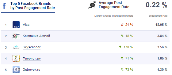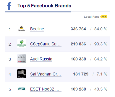 Пятерка самых популярных брендов этой социальной сети выглядит так: Beeline, Сбербанк, Audi Russia, Sai Vachan Creations, Eset Nod32 Russia. В таблице указано число локальных подписчиков и их процент от общего числа фанов: