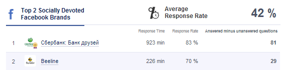 Social Bakers выделил 2 бренда, наиболее ориентированных на пользователя. В таблице указано среднее время, за которое бренд отвечает на посты пользователей, и процент постов, на которые был получен ответ: